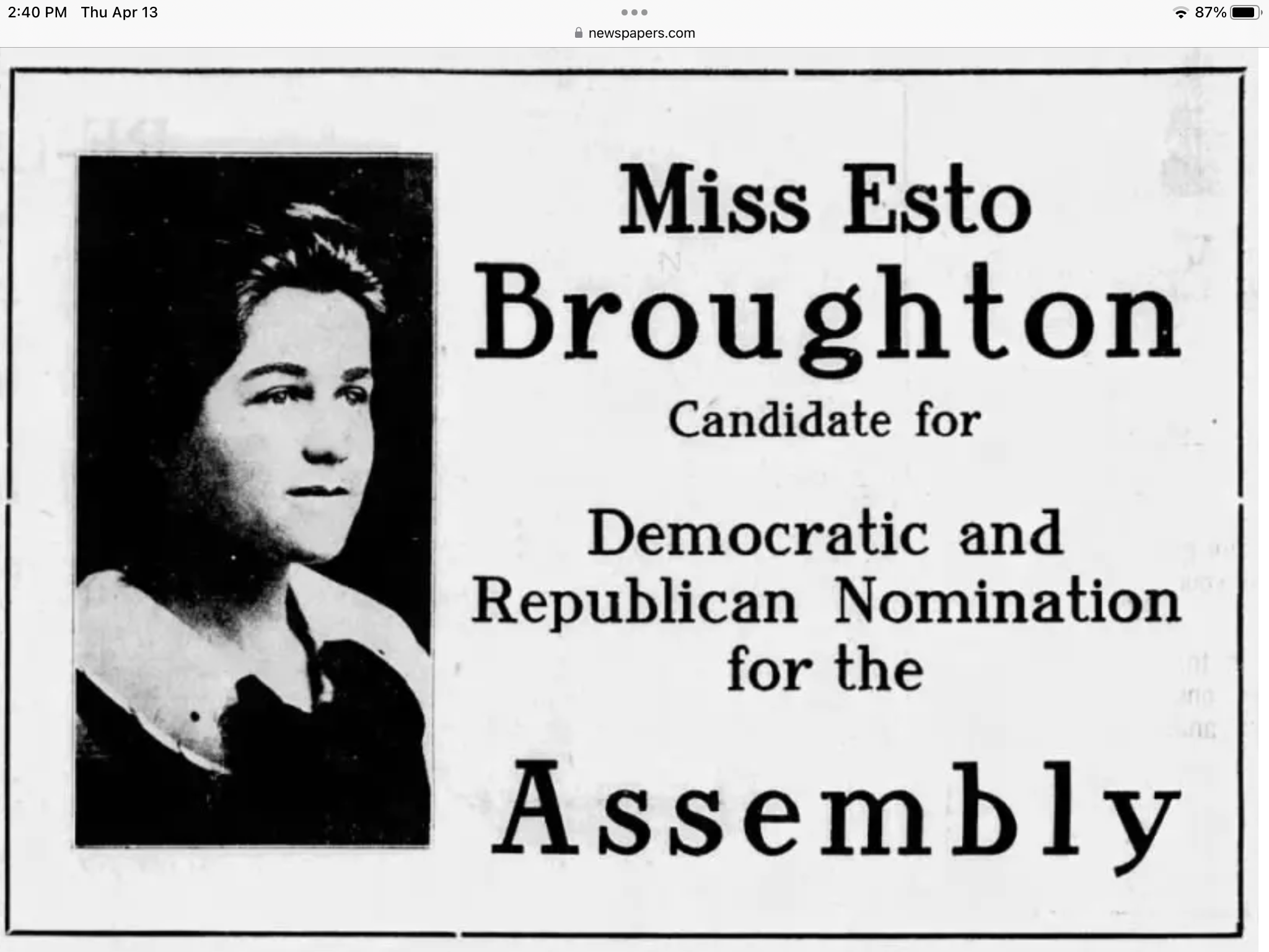 In 1918, Esto Broughton sought both the Democratic and Republican nominations for the California Assembly. She got the Democratic nomination. The other three times she ran for the Assembly, she registered as a Democrat, Republican, Socialist, Prohibitionist, and Socialist.